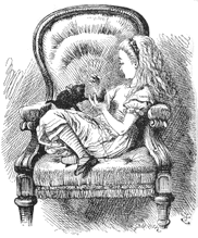 Our tale deals with a slightly older Alice and happens indoors on a snowy, winter night exactly six months after her adventures in Wonderland, on November 4th. One random evening, Alice is bored as usual and is left all alone in a room inside her mansion home with no one for company but the soothing crackling of the fireplace. Sitting in a big grown-up chair next to a window, Alice watched the snowflakes fall from the sky outside. Alice wishes to herself that she were old enough to join everyone else at the bonfire that is being held. Unable to go, Alice sulks about in a lethargic state. But her pet cat, Dinah, on the other hand, is now a mother cat of a litter consisting one black and one white baby kitten.